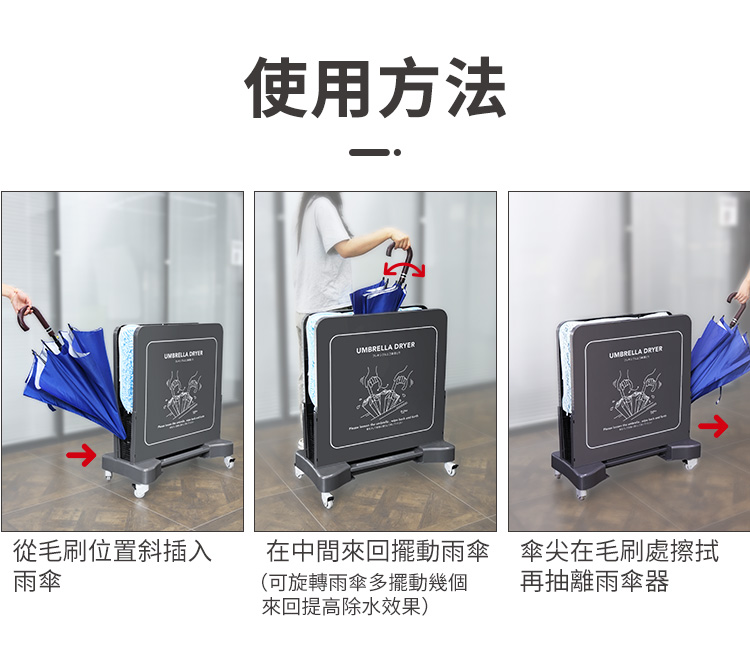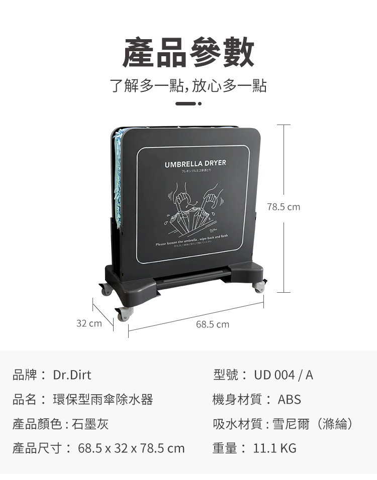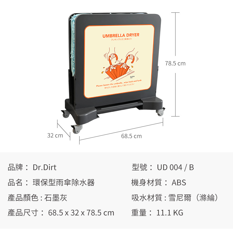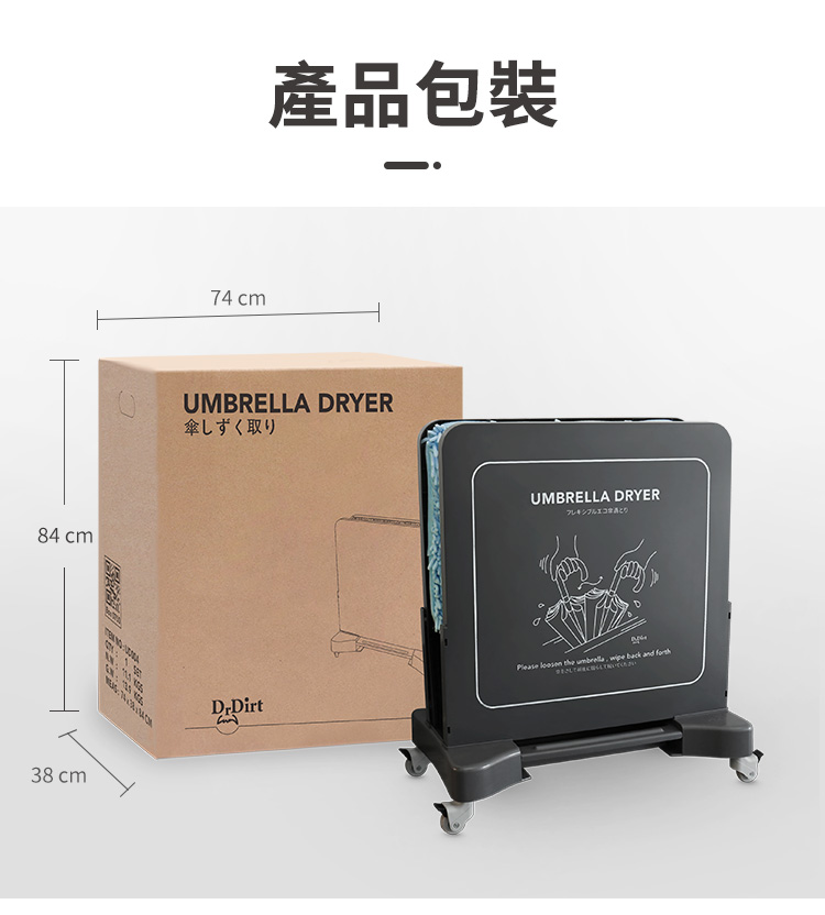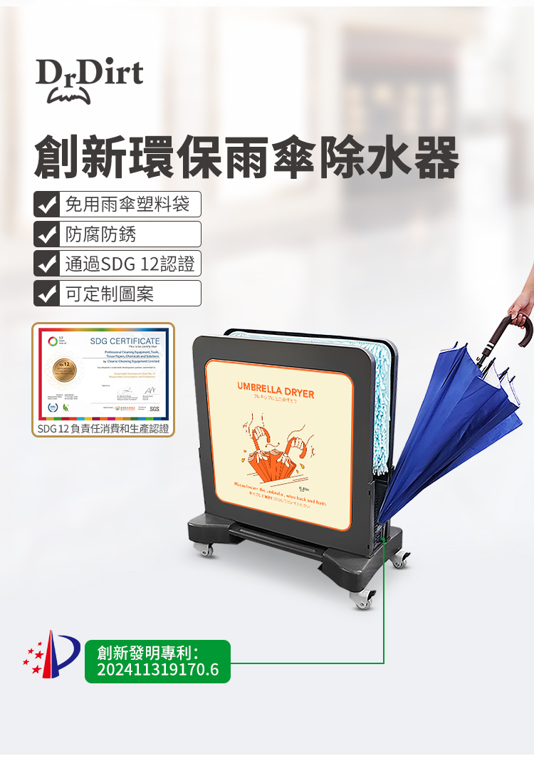 Dr.Dirt環保雨傘除水器Innovative Umbrella dryer,操作簡單,安裝簡便,無需用電,只需2-3個簡單的步驟,就能除去雨傘上的水份,保持室內地面清潔乾爽,並能有效減少使用雨傘塑膠袋,真正環保節能!現時,在日本等多國已流行除水器,可減少在下雨天商場、屋苑、商業大廈過多使用雨傘袋的情況,亦可提昇管理的形象。
