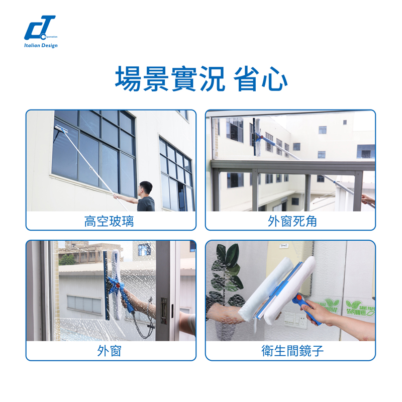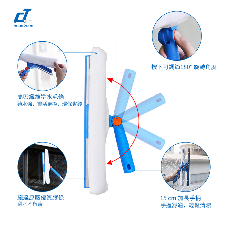 刮擦頭可180°靈活旋轉,輕鬆清潔外窗及死角