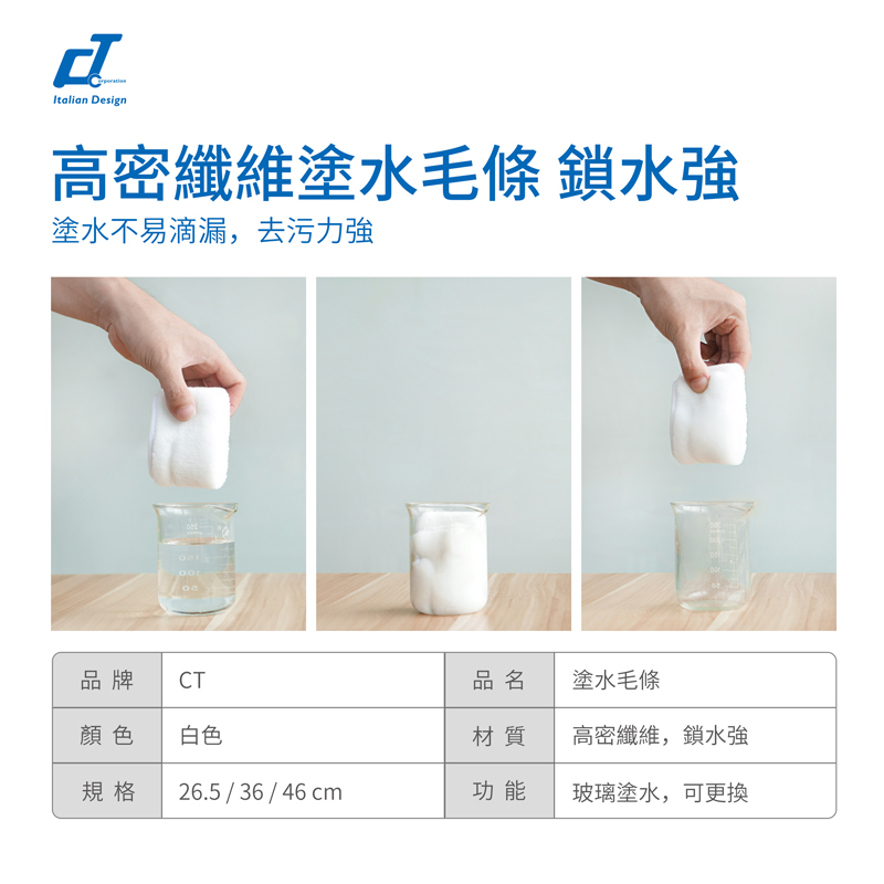 將塗水器浸入桶中,待充分吸入清潔液後用手輕輕把水分揸乾(以不往下滴水為宜),均勻塗在玻璃表面,去除表面的污漬。