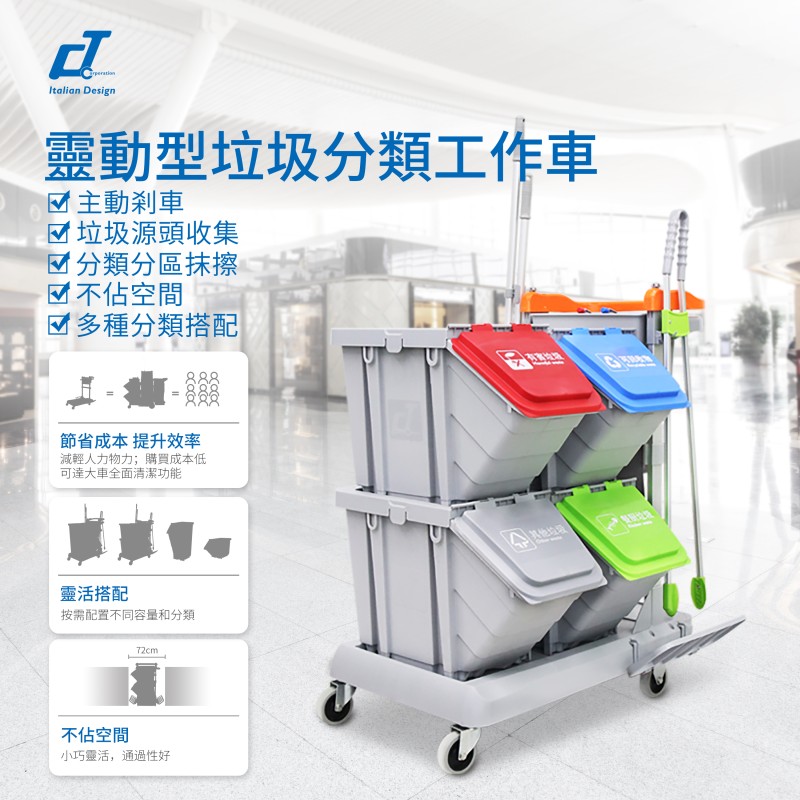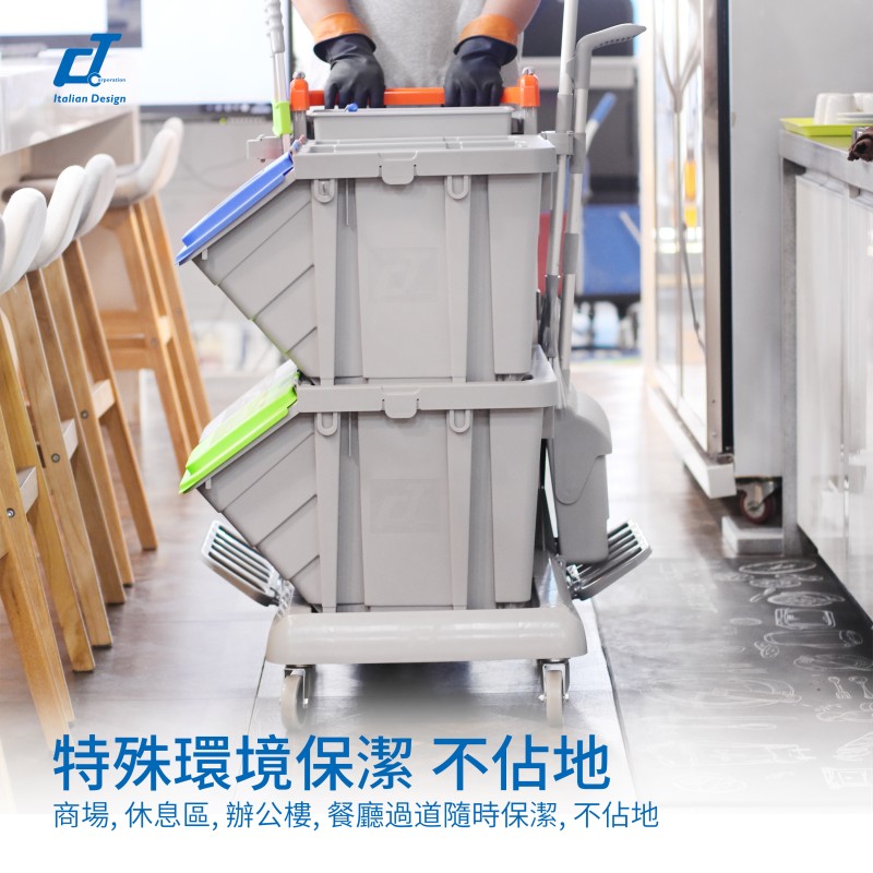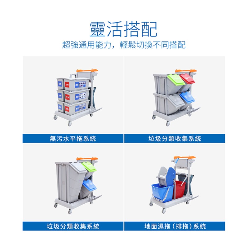 施達靈動型分類分類回收清潔車,轉為解決小範圍流動專項清潔而設計的。分類收納系統清潔車從源頭上配備垃圾分類的功能,加上無污水的清潔清潔方式,垃圾分类回收手推车為您節省垃圾分揀、節約用水的時間和成本,顯著提升工作效率。Nimble Janitorial Trolley 通用的底盤框架,可以因應不同崗位和場所配備相應的清潔系統模塊,實現一車多用,降低採購數量和成本。符合對環境衛生要求高的場所,如醫院、酒店、餐廳等地方。特別配備的自主剎車系統,做到鬆手即停,安全可靠,降低清潔進行中的安全隱患。