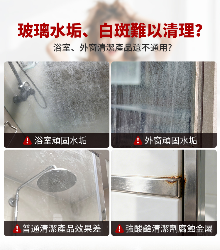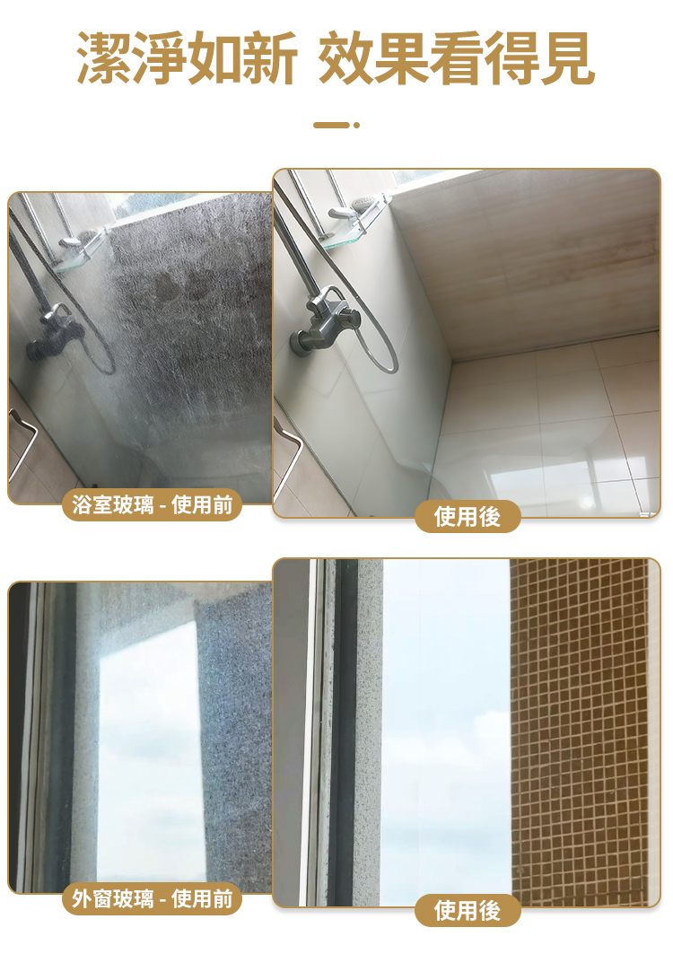 • 強效去污:輕鬆清除浴室和外窗的水垢、污漬,恢復清晰如新。