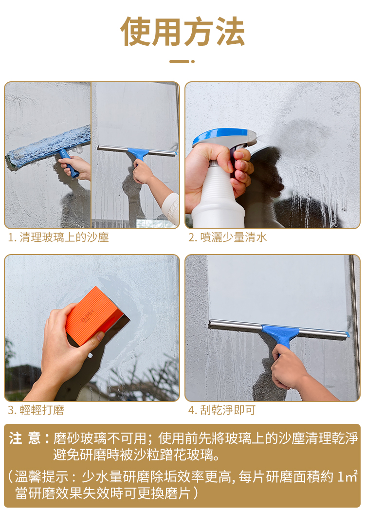 注意:磨砂玻璃不可使用;使用前先將玻璃上的沙塵清理乾淨,避免研磨時被沙粒蹭花玻璃。