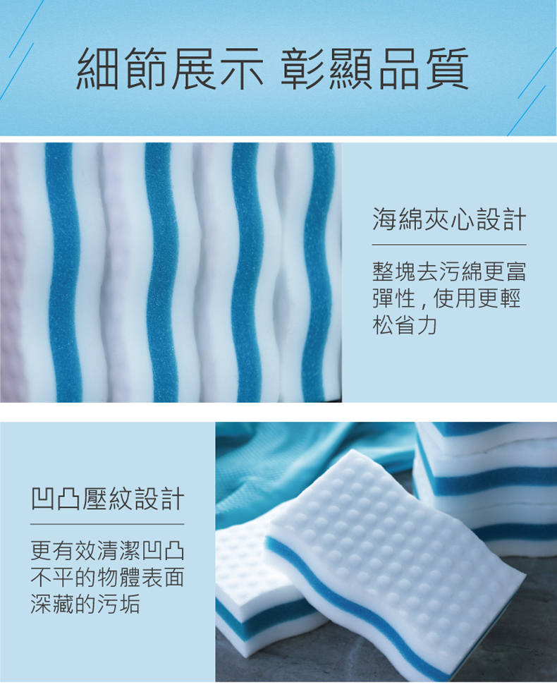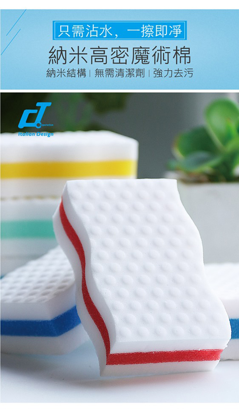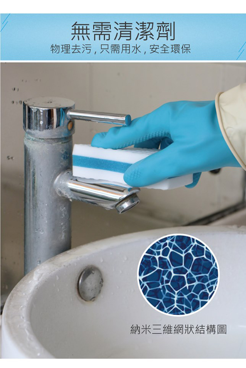 與傳統清潔海綿的最大區別在於該產品採用純物理去污機理,依靠海綿內的納米級毛細管開孔結構,在抹拭過程自動吸附物體表面的污漬,清潔效力超強、材質細密,不傷皮膚,輕鬆打理凹凸不平面、深藏的頑固污垢,不留刮痕,只需清水,使用簡單方便