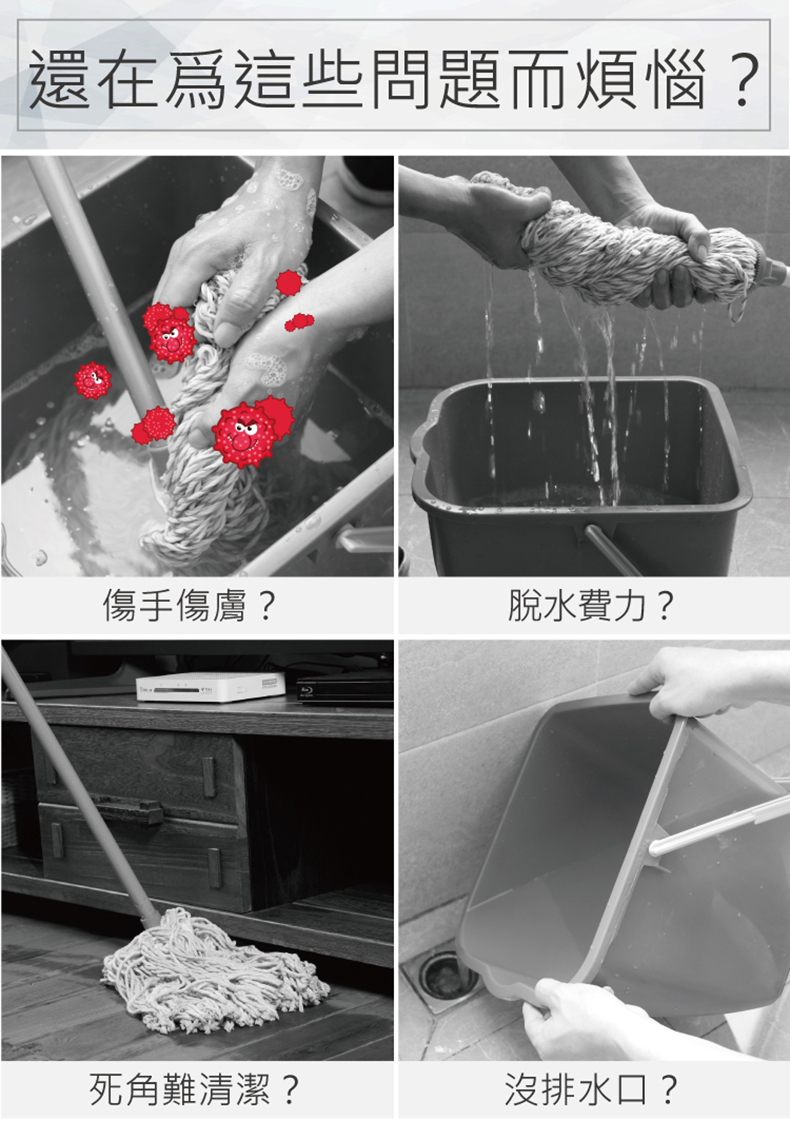 一般人平時打掃也會注重地板清潔,加上現在新冠肺炎之確診個案不斷增加,在家抗疫清洗地面一定不能忽視。但每每沾水擰乾很麻煩,洗地拖頭時容易令雙手沾上不潔的污水,費力又傷手,再加上傳統地拖在拖地時都遇都櫃底及死角位難於清潔的位置,傾倒污水時也十分費力。要完成拖洗地板也感到十分疲勞。