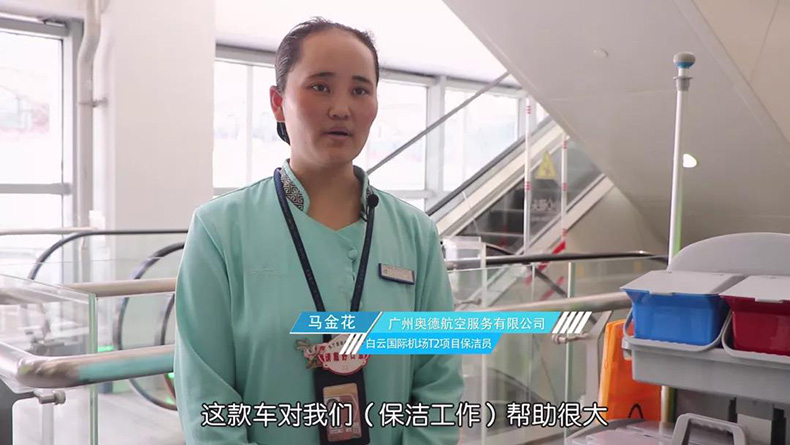 廣州白雲國際機場T2項目保潔員馬金花說到:”施達公司這款帶(主動)刹車系統的清潔服務車對我們保潔工作幫助很大,封閉的車廂、多層的儲物功能,很安全也衛生,用起來非常方便。“