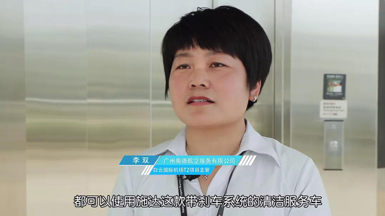 廣州白雲國際機場T2項目部保潔主管李雙說:”施達公司這款帶(主動)刹車系統的清潔服務車,首先在形象上就非常的高端,跟白雲機場的定位非常吻合。”