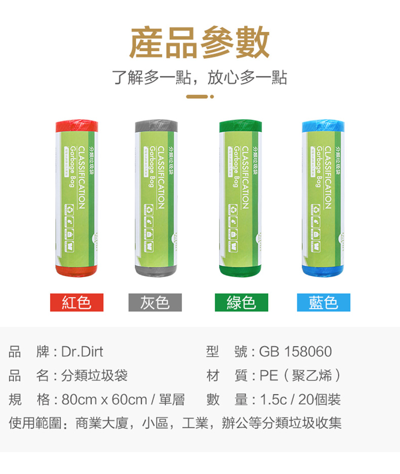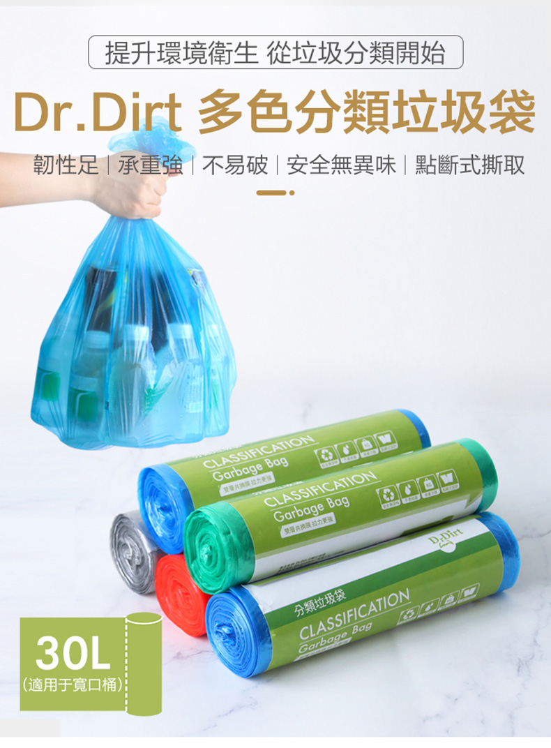 每每設計,健力都有考慮環保方向,現推出新品Dr.Dirt 多色分類垃圾袋,在家中、辦公室已可作簡單垃圾分類,為保護環境,可從源頭開始。