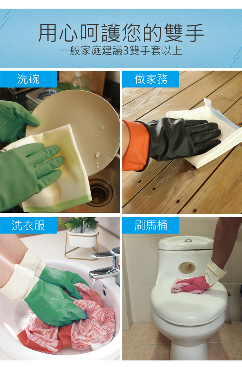 所以平日做清潔工作時,不要忘了穿上CT家用橡膠手套,加厚材質不易破,避免雙手受傷、弄髒,同時耐酸鹼,更護手。