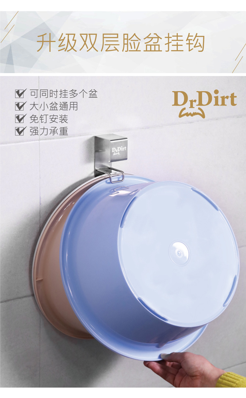今天介紹一款「Dr.Dirt不鏽鋼強力掛鈎StainlessSteel Hooks」,讓你無需電鑽的免釘膠安裝掛鈎,它能承重10kg,安在廚房可同時懸掛多個盆或瀝水篩,安在洗手間可同時輕鬆懸掛嬰兒盆和洗瞼盆等,輕鬆收納,增加工作活動空間,免釘牆安裝,防水防潮,強力承重,304不鏽鋼,結實耐用不變形。