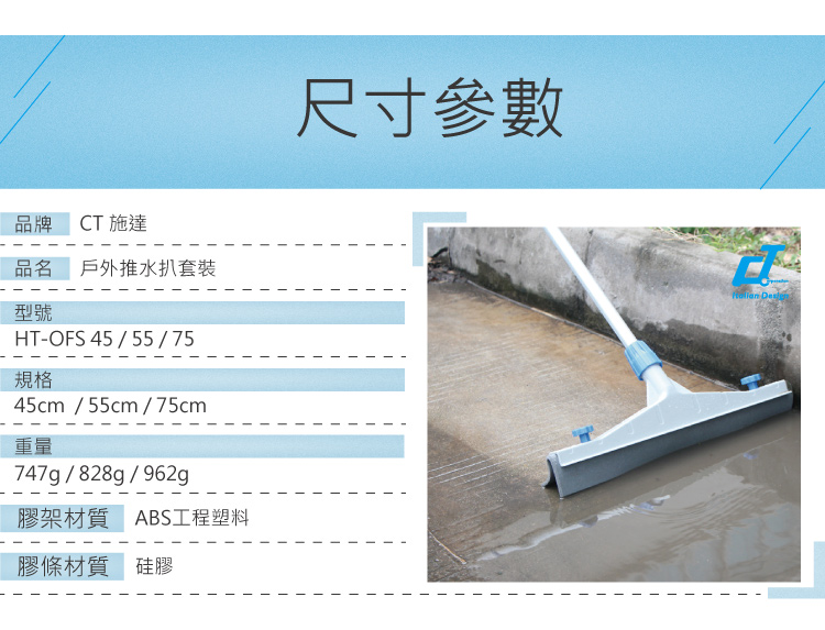 所以家中備有CT室外推水扒,扒頭的膠條採用耐磨耐油性的發泡硅膠材質,適合戶外粗糙及油跡地面;彈性好能前推後拉,刮水不留痕,還可順道將樹葉、花瓣、灰塵推走,毫不費力。有了CT室外推水扒解決漬水問題,不怕蚊蟲滋生。可搭配夾扣,輕鬆收納。