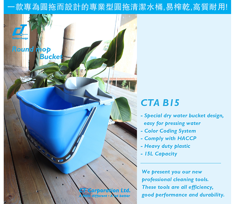 想把屋企打掃得窗明几淨,想享受一個潔淨健康的家居空間,大家家中都會有清潔四寶︰吸塵機、地拖、除塵掃、抹布。 特別每次用到地拖,我都必會搭配用CT-15L圓頭地拖桶,其採用高質塑料,堅固耐用;桶內標有容量刻度,方便控制水量及清潔劑;榨水籃位置配有卡扣,能固定地拖不倒;搭配為手部而設計的手柄手抽,方便提水倒水。人性化設計,讓你我得心應手!