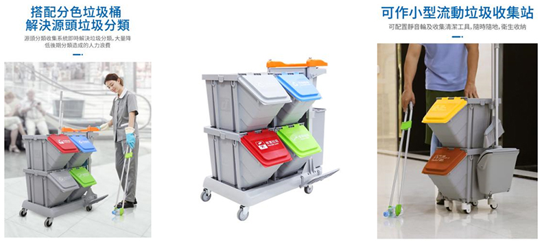 亦正因如此,施達的回收分類垃圾桶可疊放並安裝滑輪,或搭配靈動專項清潔車(帶剎車)使用,作為流動小型垃圾收集站,隨時隨地都可以完成垃圾分類收集與回收。