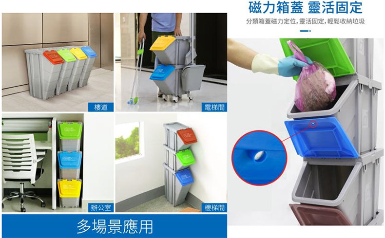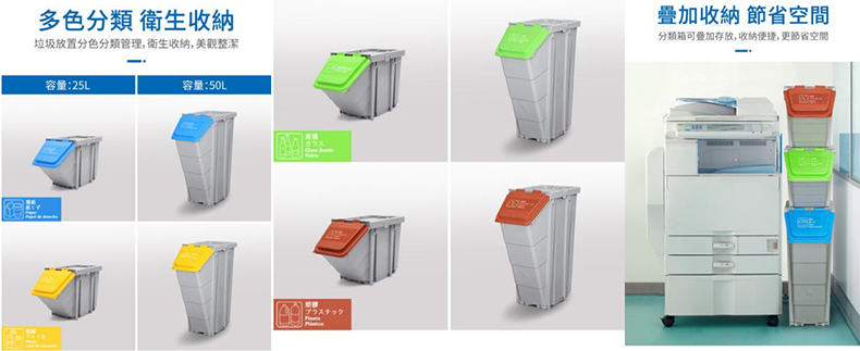 其標準分色,使用者無需重新學習分類知識,黃色回收分類垃圾桶收集鋁罐,綠色回收分類垃圾桶收集玻璃,藍色回收分類垃圾桶收集廢紙,啡色回收分類垃圾桶收集塑膠。分色分類管理,衛生收納,環境美觀整潔。