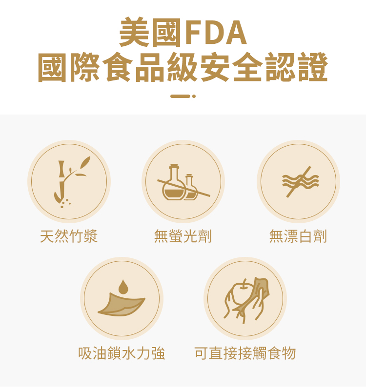- 紙巾通過美國FDA食品級安全認證,採用天然竹漿